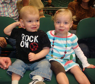 Saturday night we headed down to Orem to join the Wilson clan for a Utah Flash game. Since Jordan (my brother-in-law) practices with the team he scored us some sweet court side seats. Taryn had a BLAST watching the ball fly around and all those tall players that looked like daddy! Every time music would start she'd dance her little tooshy around and around. She also loved being with her cousins, she gobbles up the attention they give her!